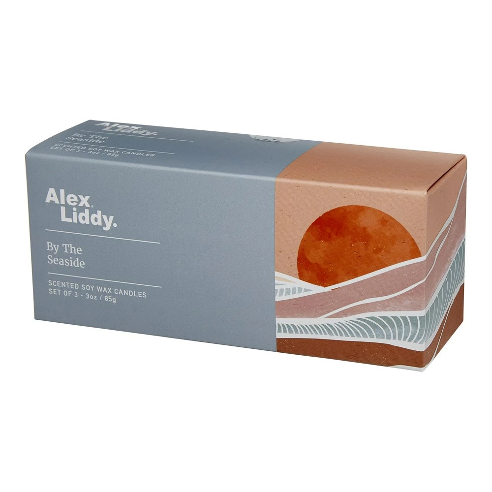 Enjoy the revitalising aroma of Wood Sage and Sea Salt around your home with the Alex Liddy Set of 3 Candles By The Seaside.