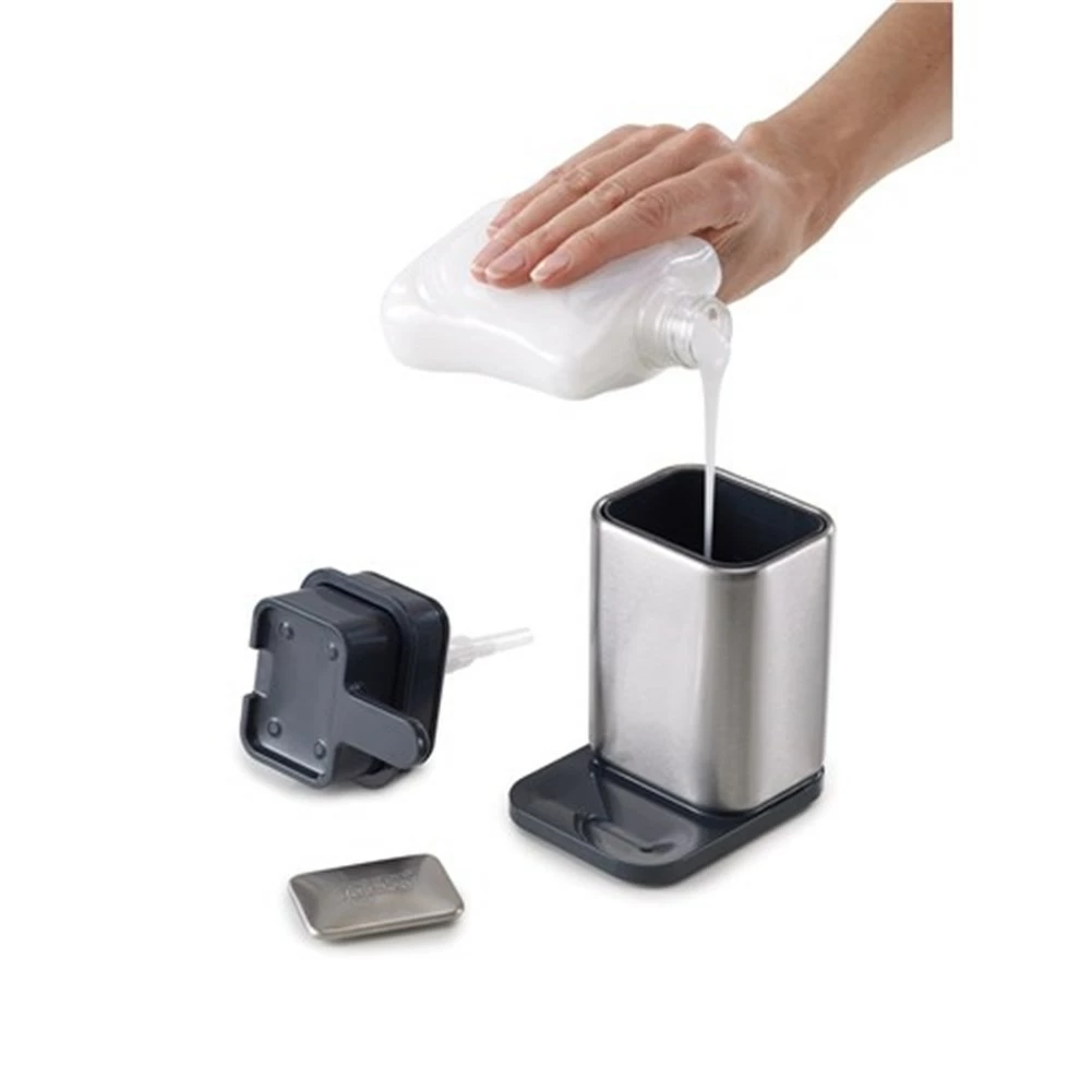 The Joseph Joseph Surface Stainless Steel Soap Pump is a stylish and unique dual-function soap dispenser