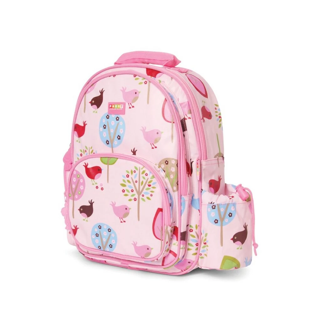 The Penny Scallan Chirpy Bird Backpack Large is the ideal size for larger kids attending school as it fits in all their essentials. The backpack straps make it easy and comfortable for your child to carry everything they need. It also includes a built in drink holder with fastening to keep multiple sized drink bottles contained. Made from 100% cotton canvas that has a scratch resistant coating and a features a polyester insert, the Penny Scallan Chirpy Bird Backpack is easy to wipe clean. The design incorporates three front pockets and a small zippered pocket to the side. As part of the Penny Scallan Chirpy Bird theme, it has light blush and pink background with birds and trees.