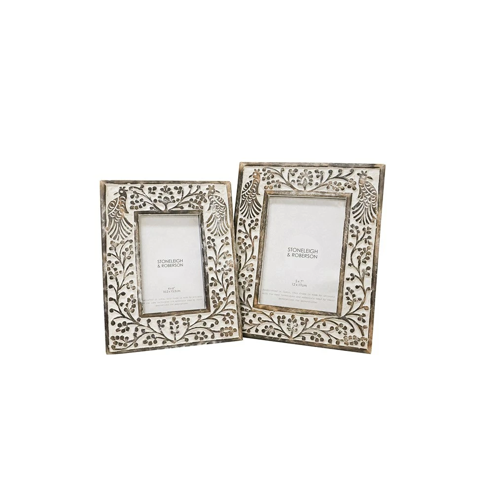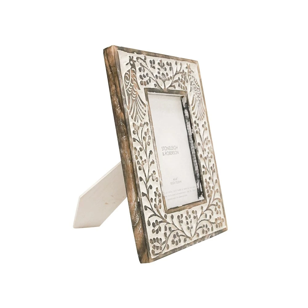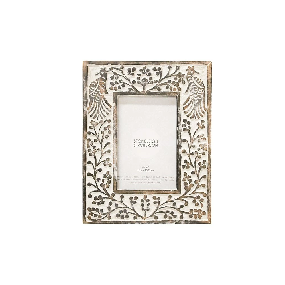 Highlight your favourite memories with the beauty of the Stoneleigh Roberson Peacock Carved Photo Frame 4×6″ White Wash. Hand-crafted in India by experienced artisans, the Stoneleigh Roberson Peacock Carved Photo Frame 4×6″ White Wash is made using exotic mango wood for an authentic natural aesthetic. This frame, featuring intricately carved peacocks and branches, has been white-washed, giving it a refreshing, vintage appeal. With the ability to be displayed vertically or horizontally, place the frame in your chosen room on a desk, mantlepiece, shelf, bedside table and more. Holding photos measuring 4×6 inches, the Stoneleigh Roberson Peacock Carved Photo Frame 4×6″ White Wash enhances whatever is displayed within, whether laughing friends, a family portrait or natural scenery.