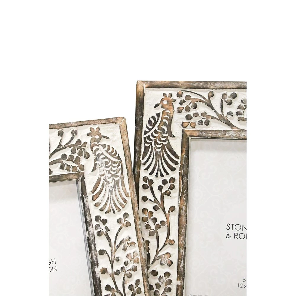Showcase a cherished memory or picturesque landscape within the Stoneleigh Roberson Peacock Carved Photo Frame 4×6″ White Wash